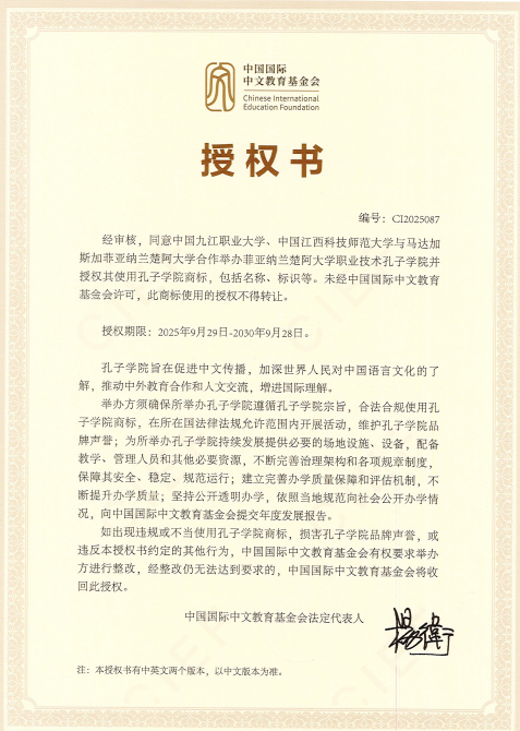 近日,经中国国际中文教育基金会审核,同意我校与九江职业大学、马达加斯加菲亚纳兰楚阿大学合作举办菲亚纳兰楚阿大学职业技术孔子学院,并获授权使用孔子学院商标。这是我校继摩洛哥阿卜杜·马立克·阿萨德大学孔子学院成功运营后的又一重要成果,标志着学校国际中文教育事业的进一步拓展,也为中马两国在语言交流与职业教育深度协作搭建起了全新平台。