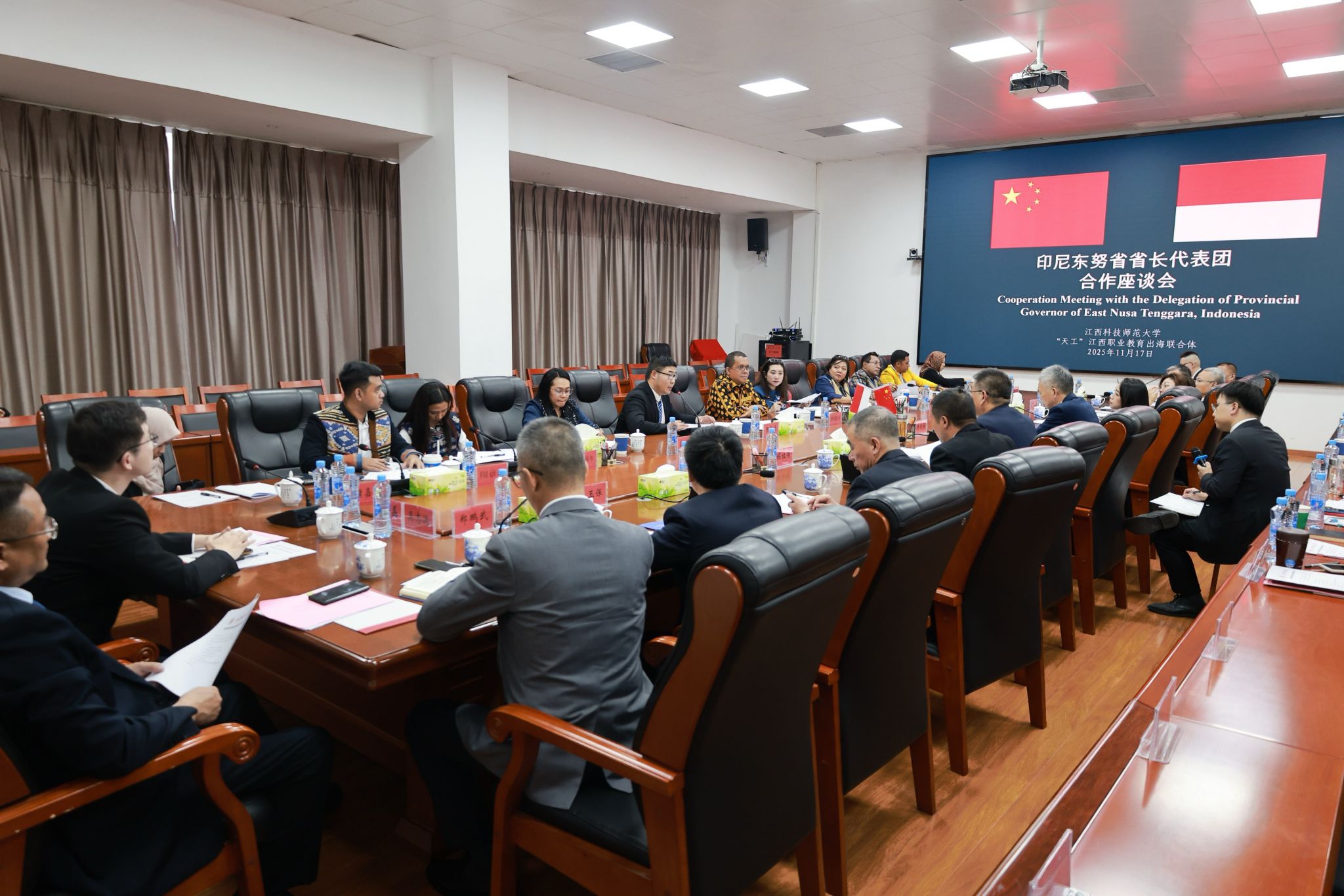 11月17日下午,印尼东努沙登加拉省(东努省)省长代表团来校交流访问。代表团一行与“天工”江西职业教育出海联合体在我校红角洲校区图书馆第二会议室举行交流座谈会。双方就进一步扩大和深化江西和东努省合作领域进行会谈并达成共识。