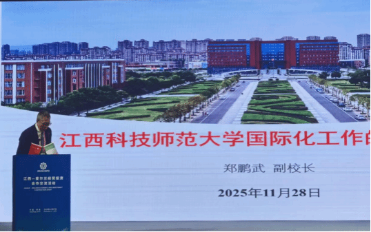 2025年11月27日下午,由江西省人民政府主办的2025世界绿色发展投资贸易博览会暨中国绿色食品博览会分会——“江西—爱尔兰经贸投资合作交流会”在南昌绿地铂瑞酒店成功举办。我校党委委员、副校长郑鹏武应邀出席并作题为“江西科技师范大学国际化工作的创新实践”的主旨发言。
