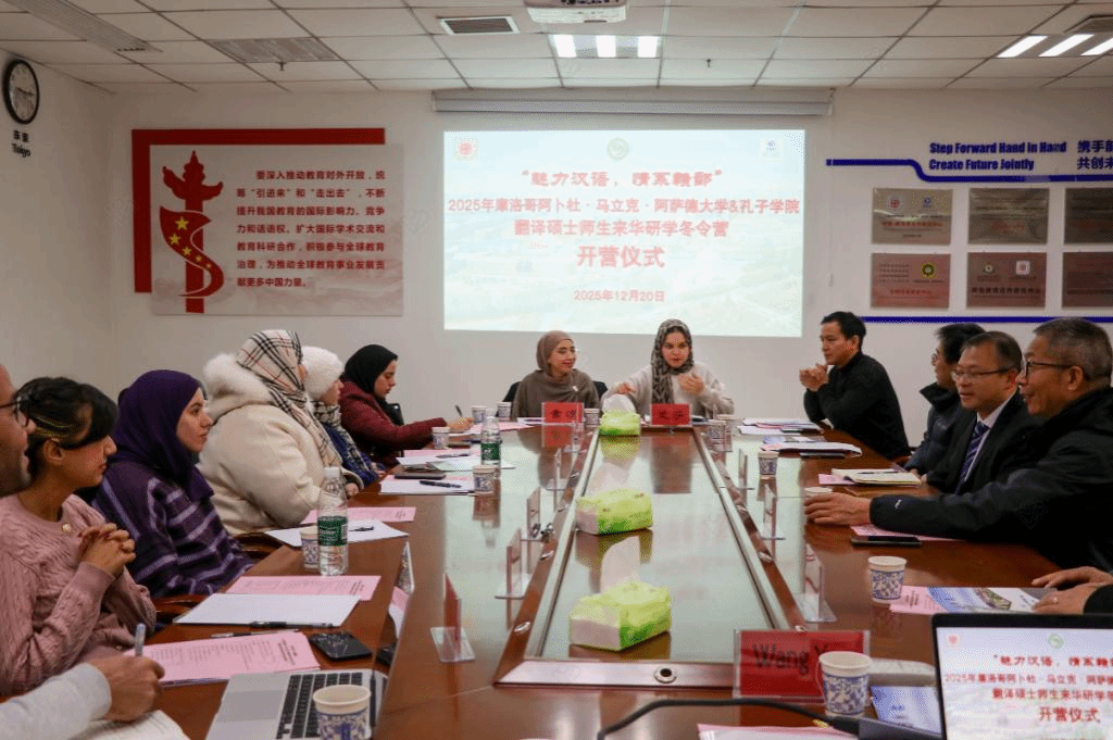 12月22日上午,2025年摩洛哥阿卜杜・马立克・阿萨德大学与孔子学院翻译专业硕士师生来华研学冬令营开营仪式在我校红角洲校区图书馆 824会议室举行。副校长郑鹏武出席。